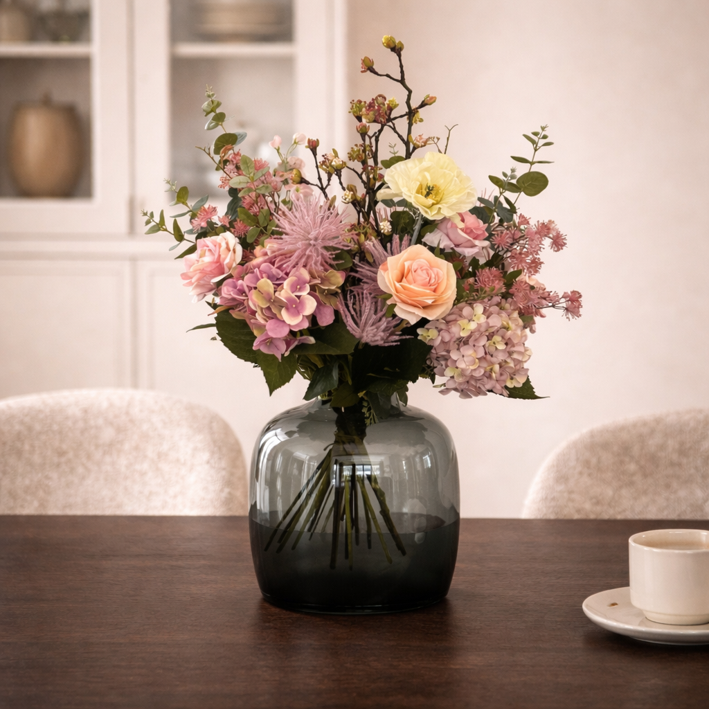 Het schoonmaken en onderhouden van kunstbloemen is eenvoudig en kost weinig tijd. Door ze af en toe te reinigen behouden ze hun frisse en luxe uitstraling. Verwijder eerst het stof met een plumeau of een zachte borstel zodat de bloemblaadjes en bladeren weer mooi tot hun recht komen. Je kunt ook een föhn op een lage stand gebruiken om stof voorzichtig weg te blazen. Hebben de kunstbloemen een grondigere reiniging nodig dan kun je ze voorzichtig wassen met lauw water en een mild reinigingsmiddel zoals afwasmiddel. Gebruik een zachte doek of spons om vuil te verwijderen spoel daarna af met schoon water en laat de bloemen volledig drogen voordat je ze terugzet. Voor grotere boeketten of arrangementen kun je een stofzuiger met een zacht borstelmondstuk gebruiken om stof en vuil rustig weg te zuigen. Met deze eenvoudige zorg blijven je kunstbloemen langdurig mooi en geven ze je interieur steeds weer een verzorgde uitstraling.