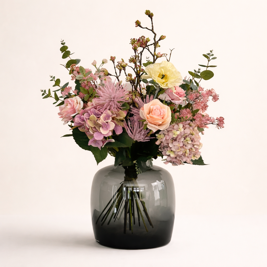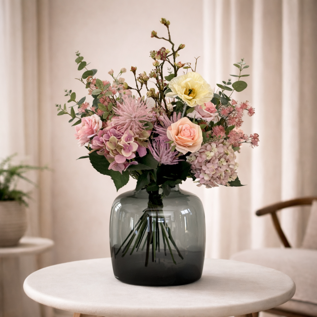 Summer Glow is een verfijnd kunstboeket dat een zomerse elegantie toevoegt aan ieder interieur. De warme, stralende kleurtinten creëren een frisse en uitnodigende sfeer, terwijl de zorgvuldig geselecteerde bloemvormen zorgen voor een luxueuze en evenwichtige compositie. Het ontwerp is stijlvol en trekt moeiteloos de aandacht zonder te overheersen.