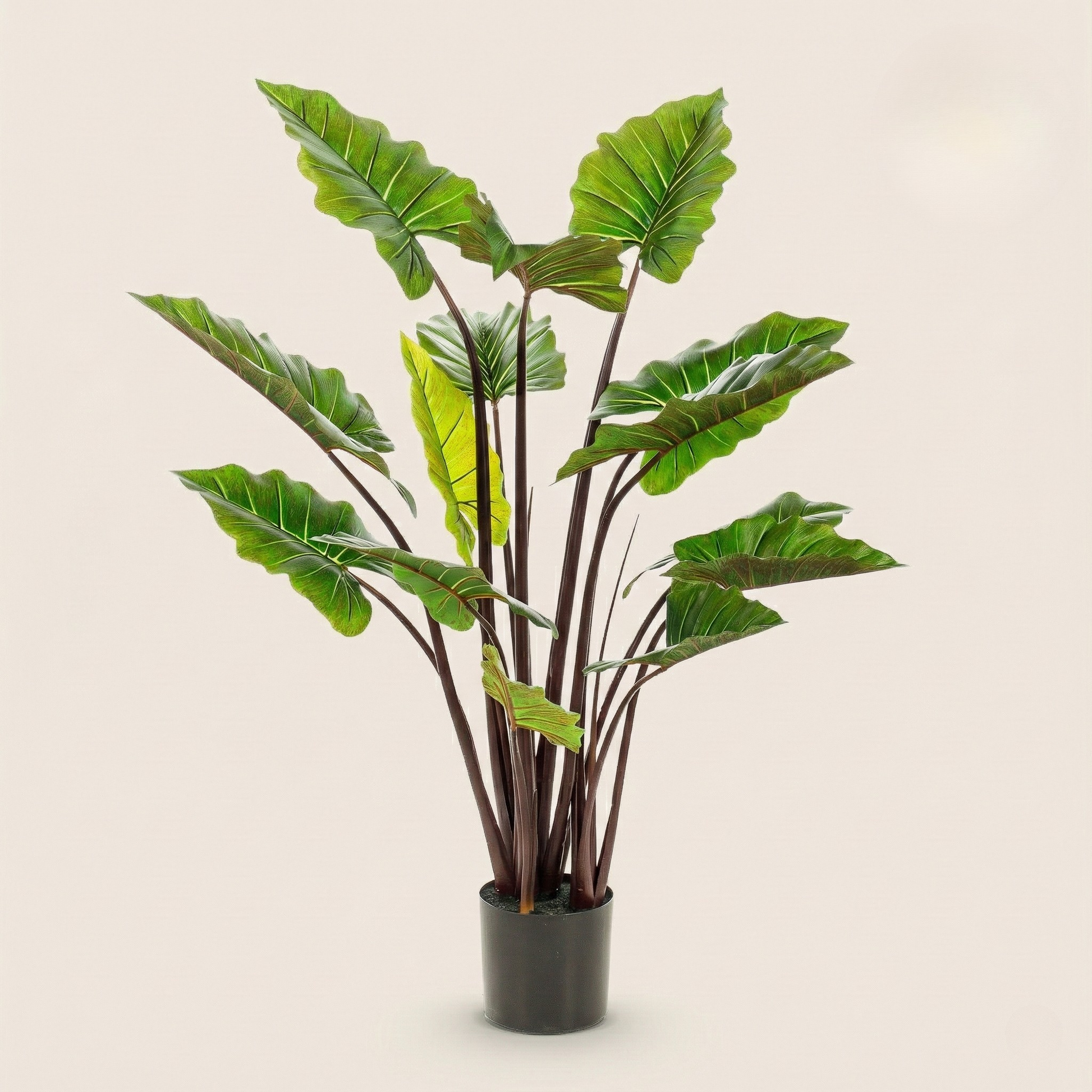 Deze kunst Colocasia kenmerkt zich door zijn grote hartvormige bladeren en de unieke roze-rood getinte stelen die zo typerend zijn voor de 'Pink China' variant. De bladeren zijn natuurgetrouw vormgegeven met gedetailleerde nerven en een frisse groene kleur. Dit zorgt voor een speels en kleurrijk contrast dat direct de aandacht trekt en een botanische upgrade geeft aan je woonkamer, hal, kantoor of ontvangstruimte.