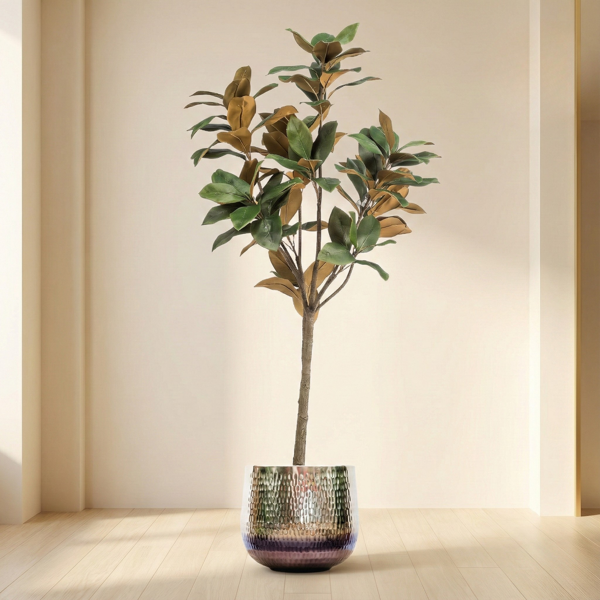 De kunst Magnolia heeft een weelderige opbouw met stevige takken en grote leerachtige bladeren die natuurgetrouw zijn vormgegeven. De diepe donkergroene kleur en de subtiele glans vangen het licht op een rustige manier waardoor de boom net dat luxe accent geeft in je woonkamer, hal, kantoor of ontvangstruimte. Tussen het blad vind je indrukwekkende grote bloemen die zorgen voor extra diepte en authenticiteit.